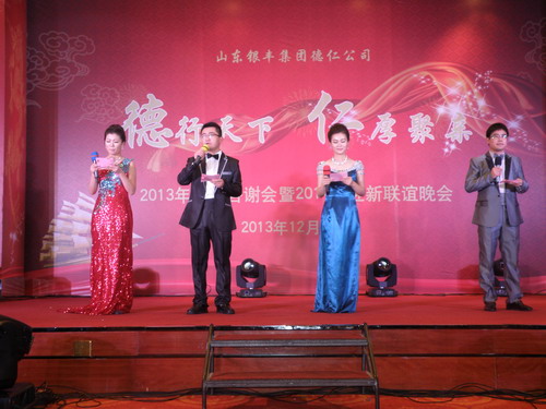 2013年12月21日下午16時(shí),山東德仁經(jīng)濟(jì)貿(mào)易有限公司2013年“德行天下 仁厚聚親”廠商答謝會(huì)暨2014年新春聯(lián)誼晚會(huì)于藍(lán)海大酒店藍(lán)海大廳如期召開。本次大會(huì)到會(huì)廠商、經(jīng)銷商代表及社會(huì)各界來(lái)賓共計(jì)130余人,銀豐集團(tuán)董事長(zhǎng)王偉先生、金融投資事業(yè)部總經(jīng)理趙曉陽(yáng)先生、總經(jīng)理助理張伊辰女士、德仁公司總經(jīng)理朱倩女士等領(lǐng)導(dǎo)出席了答謝會(huì)。