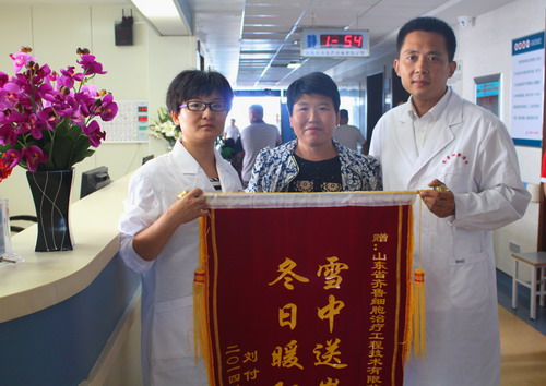 2014年8月14日上午,在醫(yī)院腫瘤科完成自體血液采集工作后,患者劉某家屬解女士激動(dòng)地向山東省齊魯細(xì)胞治療工程技術(shù)有限公司相關(guān)人員及醫(yī)院腫瘤科全體醫(yī)護(hù)人員敬獻(xiàn)了旌旗,表達(dá)謝意。