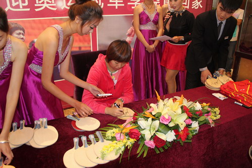 此次迎接奧運冠軍入主為鄰,讓銀豐·唐郡住區廣大準業主們顯得異常興奮,大家早早就翹首企盼奧運冠軍的到來!在銀豐·唐郡項目營銷中心現場,李曉霞及家人認真聽取了銀豐·唐郡項目置業顧問對項目的介紹和房型推薦,參觀了銀豐·唐郡項目的樣板間。在現場互動的環節,李曉霞留下了自己的手模,并在球衣和球拍上簽名紀念。