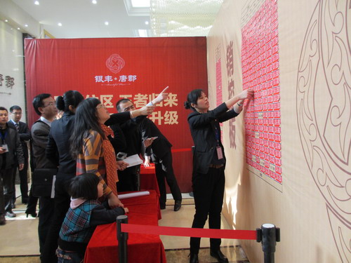 2013年3月16日,銀豐唐郡精系新品應市加推,300余名泉城市民再次聚首,現場火爆。早上8時30分,濟南及周邊的中高端置業者熱聚一堂,偌大的營銷中心已是座無虛席。在工作人員引導下,前來參與開盤儀式的客戶在客戶休息區靜候選房,同時品嘗著銀豐唐郡精心準備的水果、甜點。據現場工作人員介紹,銀豐唐郡本次開盤主力戶型為54㎡的精致一居和123-141㎡舒適三居,都是銀豐唐郡傾情打造的經典戶型,為居者提供完美生活空間。有幾位市民表示,銀豐唐郡價格合適,戶型也很好,性價比較高,希望能選到稱心如意的房子。