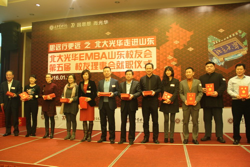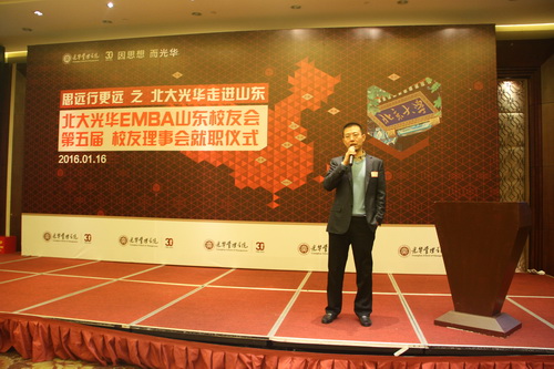 2016年1月16日,“思遠(yuǎn)行更遠(yuǎn)”北大光華EMBA走進(jìn)山東濟(jì)南活動(dòng)暨EMBA山東校友會(huì)第五屆校友理事會(huì)就職大會(huì)在山東大廈隆重舉辦。北京大學(xué)光華管理學(xué)院院長(zhǎng)蔡洪濱教授、光華管理學(xué)院黨委書記冒大衛(wèi)博士、山東銀豐投資集團(tuán)董事長(zhǎng)王偉等百余位校友及山東當(dāng)?shù)貎?yōu)秀企業(yè)家參會(huì)。