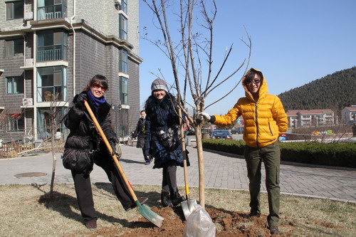 上午9點(diǎn)30分,參加人員集合完畢,首先由銀豐集團(tuán)副總裁彭秀玲女士做了動(dòng)員講話,向大家講解了植樹節(jié)的來歷,使大家明白植樹造林的意義。隨后,景觀綠化工程師汪航輝給大家說明了植樹的樹種及種植要求。介紹完后,大家便忙活起來,挖坑、栽植、填土、澆水,到處都是忙碌的身影,透心的春寒早已被大家滿腔的愛綠、護(hù)綠熱情所掩蓋。這次的活動(dòng)更得到了銀豐山莊業(yè)主的大力支持,業(yè)主們組織了植樹小分隊(duì),其中年齡最大的83歲,最小的只有4歲,都積極參與到本次活動(dòng)中。