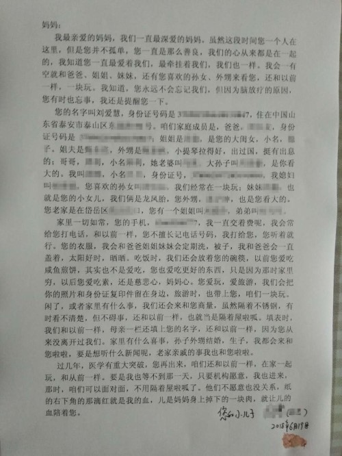 “您永遠不會忘記我們,但因為腦放療的原因,你有時也忘事,我還是提醒您一下”,母子情深,滴血為約,小兒子為了不讓母親忘卻現在的記憶,含淚寫下期盼喚醒母親未來記憶的信,信中寫道,“家里一切如常,您的手機,我一直交著費呢……”