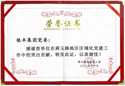 2019年6月28日,濟南市中區舜玉路街道2019年七一表彰會在舜耕山莊召開。為紀念中國共產黨成立98周年,充分展示黨建工作的豐碩成果,進一步激勵基層黨組織和廣大黨員立足崗位爭先進、創優秀,舜玉街道黨工委對街道轄區內先進黨組織和優秀共產黨員予以表彰。銀豐集團黨委榮獲“區域化黨建工作突出貢獻黨組織”殊榮。